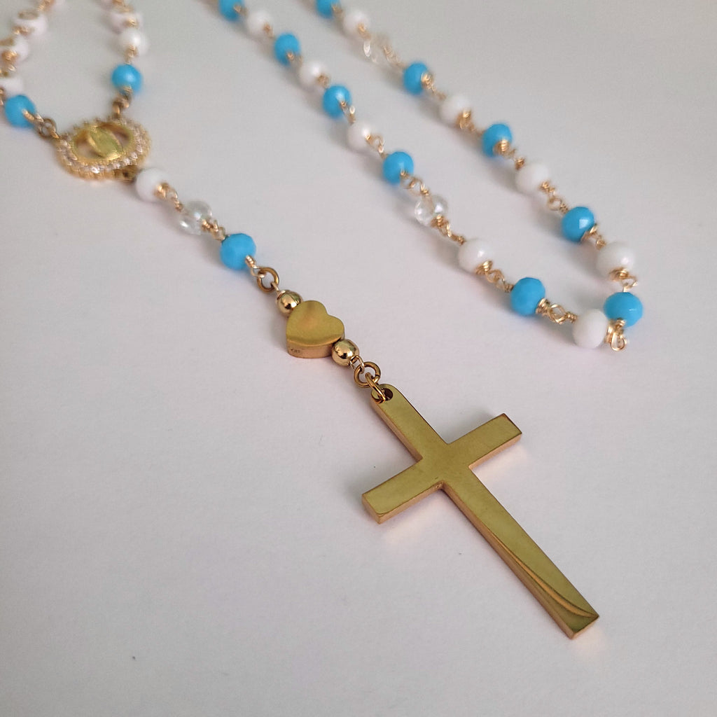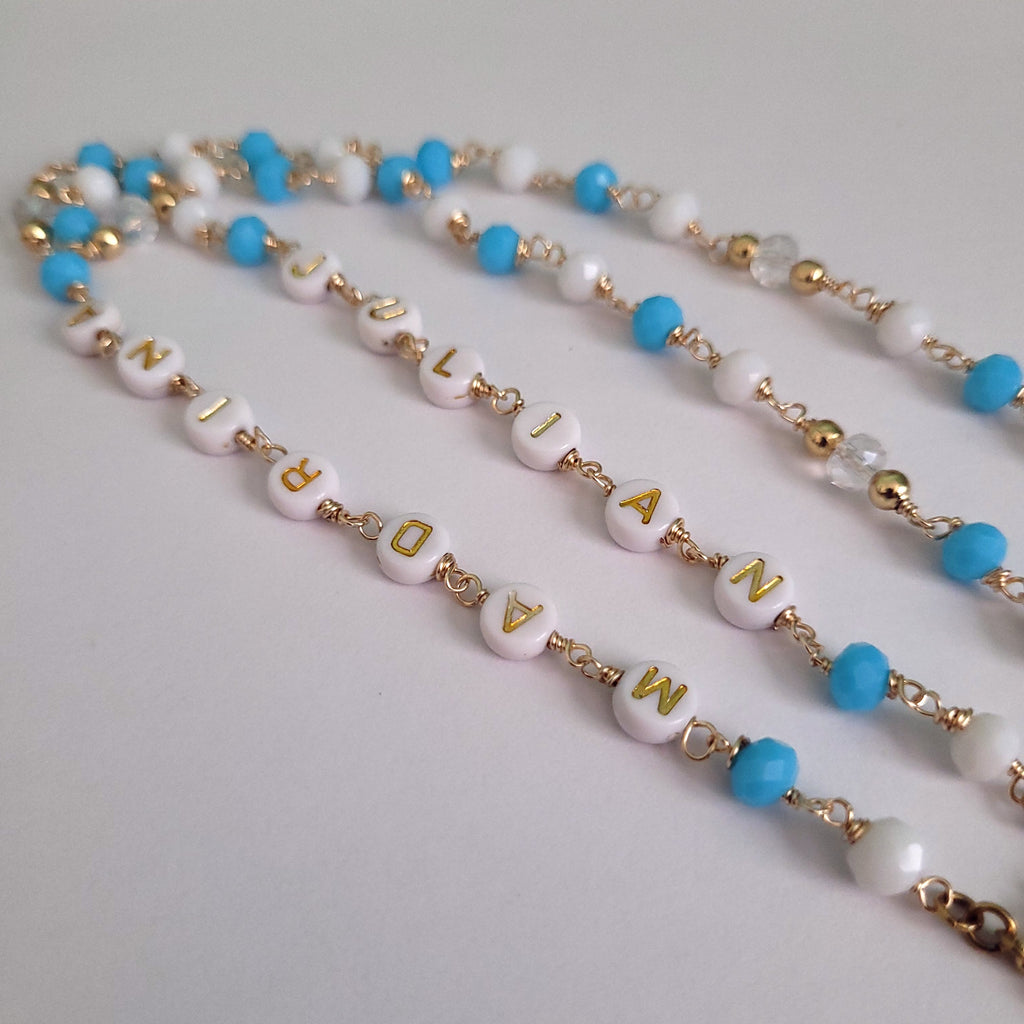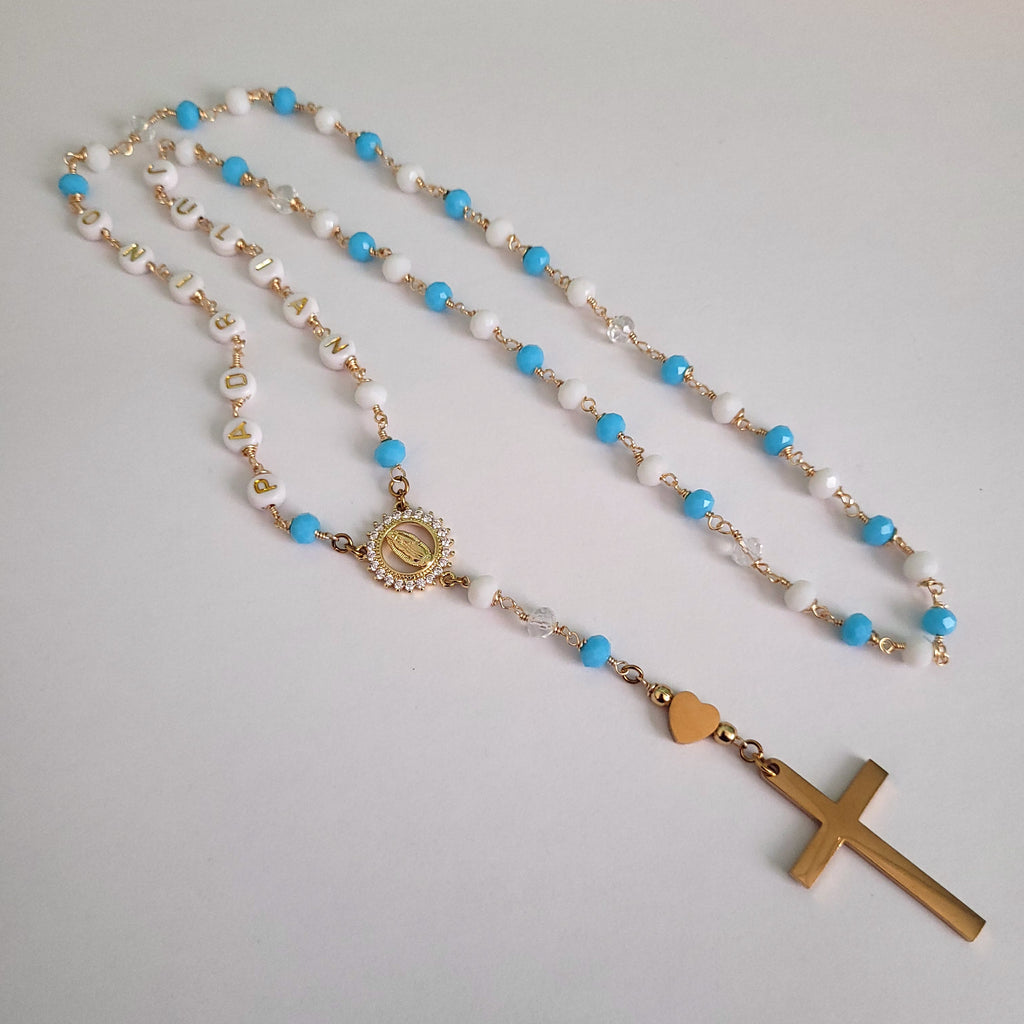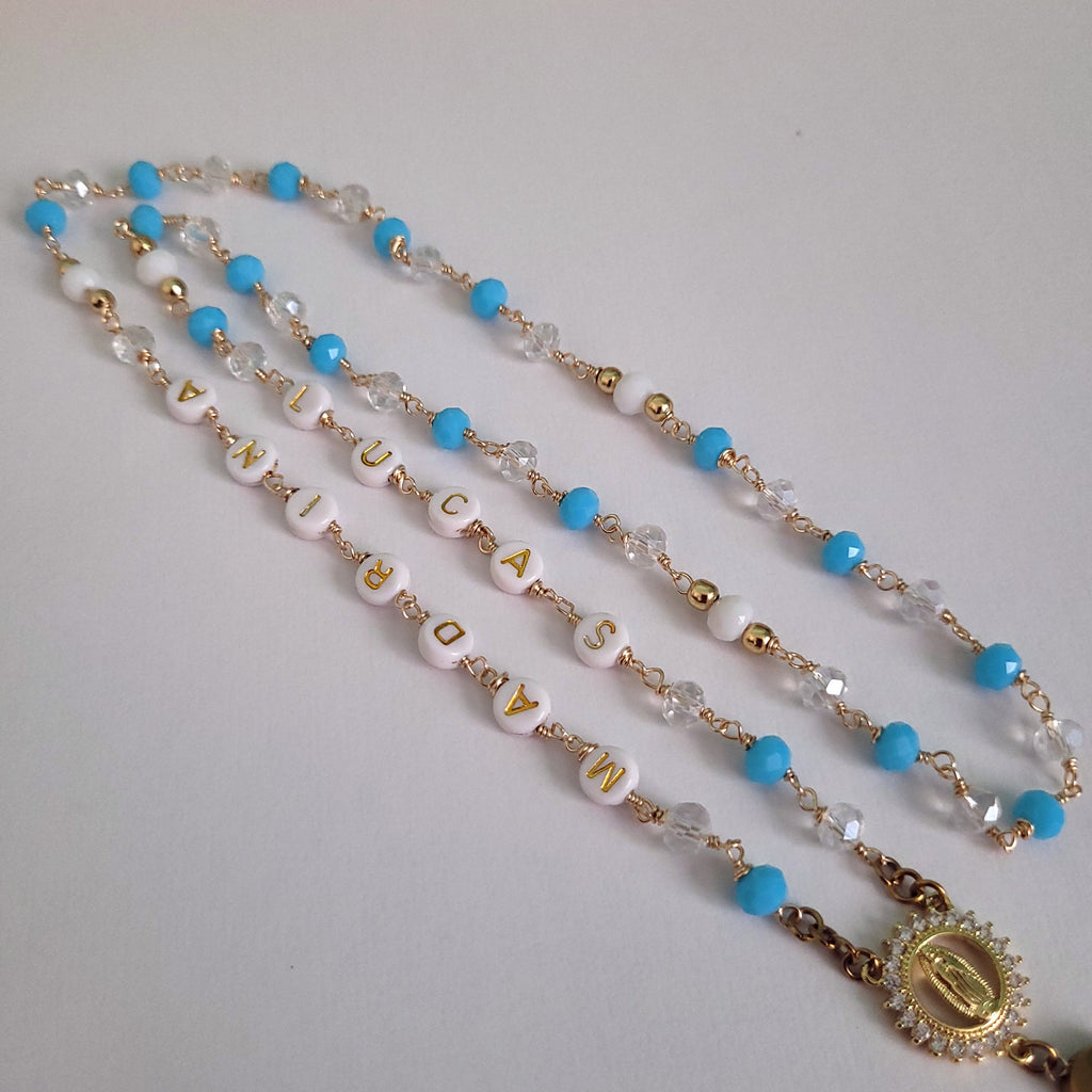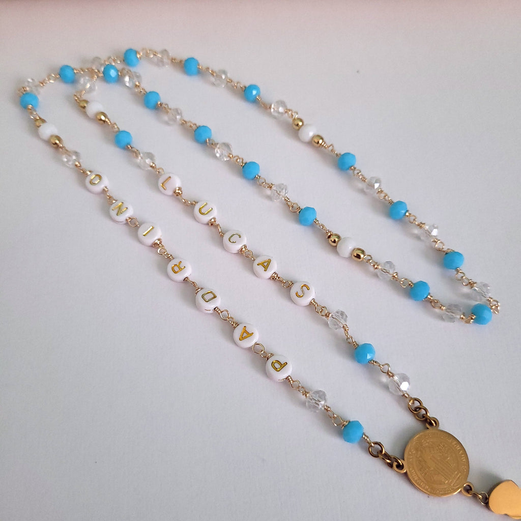 ¿Quieres tener o regalar un rosario personalizado? Con esta pieza, puedes escoger los nombres o palabras que tenga a los lados. Más hacer la combinación de hasta dos colores. Ideal para regalos de bautismo, cumpleaños o momento especial.